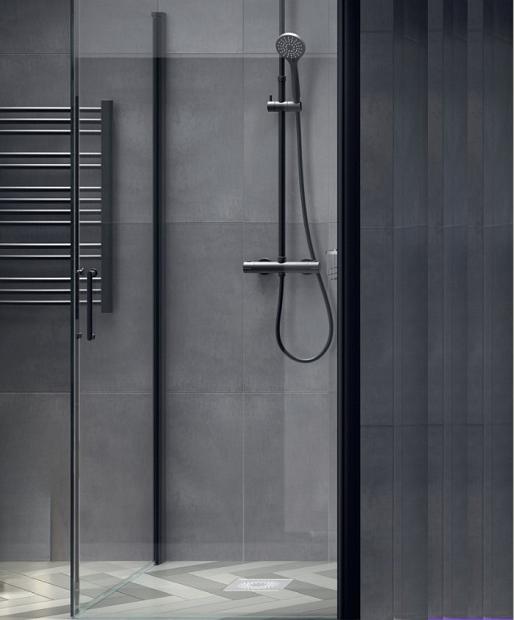 Elegant og plassbesparende dusjhjørne med Imber dusjdører i matt sort: Størrelse 100x100
