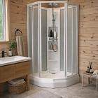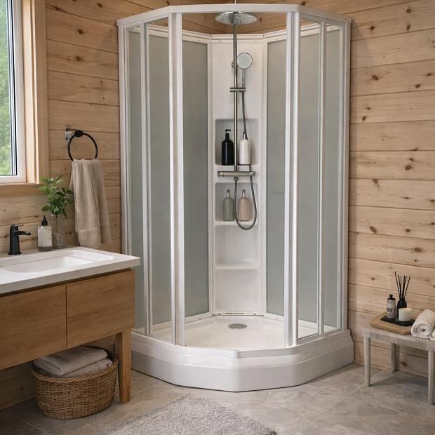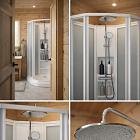 Lekkert og utrolig solid dusjkabinett med praktiske hyller i hjørnet.