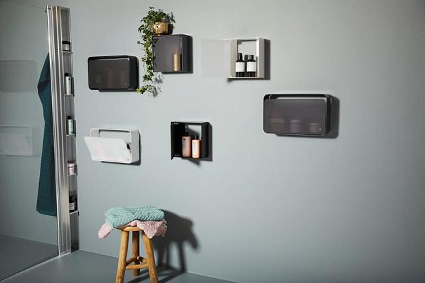 La NEST oppbevare flaskene godt skjult for omgivelsene på veggen i eller utenfor dusjen. Vipp ut den frostede døren, og få full oversikt over dusjproduktene. Den rominndelte døren slås ut 45° og sikrer at flaskene ikke faller ut. Bunnen har avrenningshull for enkel rengjøring.