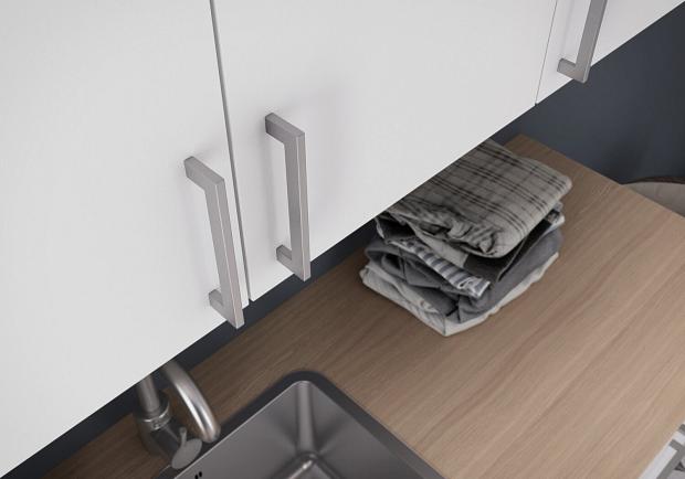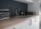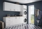 Vaskerom vist i kvit matt i 260 breidde. Det kan vere lurt å plassere vaskemaskin og tørketrommel oppå kvarandre for å utnytte plassen godt. Skap over vaskemaskin og tørketrommel gir bonusplass til mindre rom. Overskap over heile benkeplata gir mykje plass til oppbevaring.