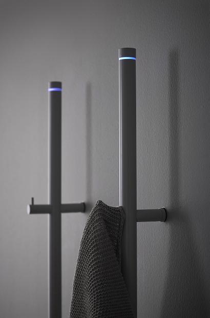 Den elektrisk oppvarmede LINE håndkletørker har en design som passer inn overalt, og med to lengder, 1750 og 850 mm, finnes det en LINE for både store og små. Husk å bestille knagger i samme farge!