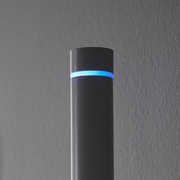 - Av- og påknapp i toppen som lyser med blått lys når den er på.