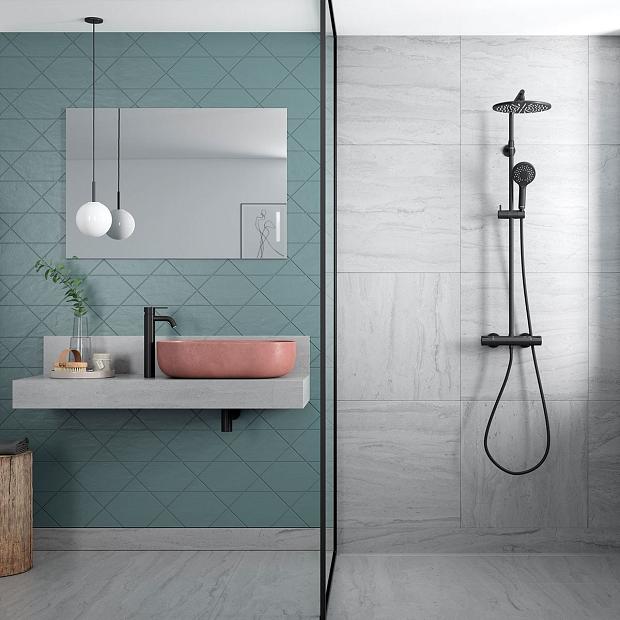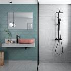 Komplett takdusj med 2050mm takdusjhode. Hånddusj med 140mm dusjhode og rubcelan. Justerbar stang 1020-1250mm. Vender mellom kaldt og varmt vann i termostatkranen. Skoldesperre.