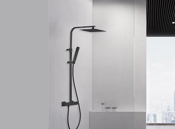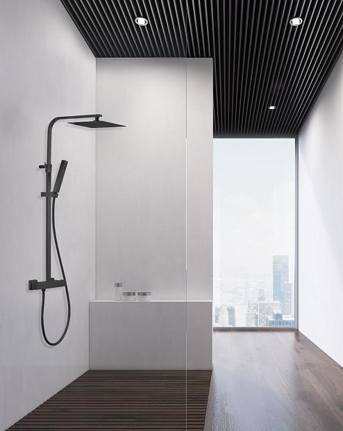 Stram takdusj med firkantet termostatkran, stang og takdusjhode. Bredde 250 mm på takdusjhode. Firkantet tubehånddusj – en innstilling på strålen. Vender i termostat. Justerbar høyde på stang ved montering.1034-1400mm