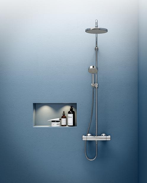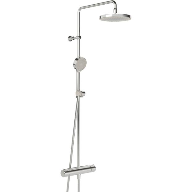 Komplett takdusj i krom som inkluderer en ny og forbedret comfort termostat, rainshower takdusj, hånddusj, dusjstang- og slange. Tak- og hånddusj er utstyrt med silikondyser, som er enkle å holde rene på grunn av anti-kalk teknologi.
