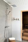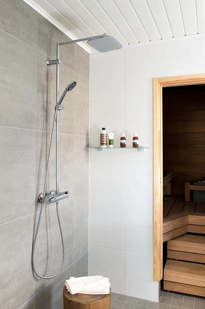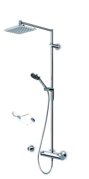 Rain shower takdusjsett med hånddusj og termostatstyrt dusjkran med grepsvennlige hendelratt. Enkel betjening av vender og temperatur-begrenser. Økovennlig mengdekontroll. Hånddusj med ulike stråletyper for en bedre dusjopplevelse, kalkavvisende silplate, dusjholder og veggbrakett. Kranen er utstyrt med smussfilter og tilbakeslagsventil.