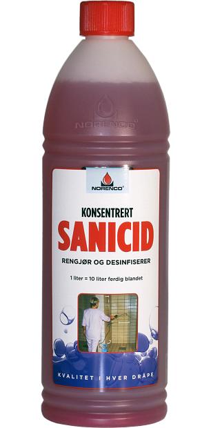 Sanicid Konsentrat blandes 1:10 deler vann, og kan brukes i bøtte eller på spray.